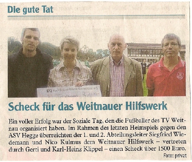 2007 stand eine Veranstaltung auf dem Programm die uns als Abteilung auch als ein Teil unserer Gemeinde und unseres Ortes darstellte, der Soziale Tag. Auf Grund vieler Aktivitäten kam die stolze Summe von 1500,- € zusammen, die dem Hilfswerk Weitnau zugute kam.