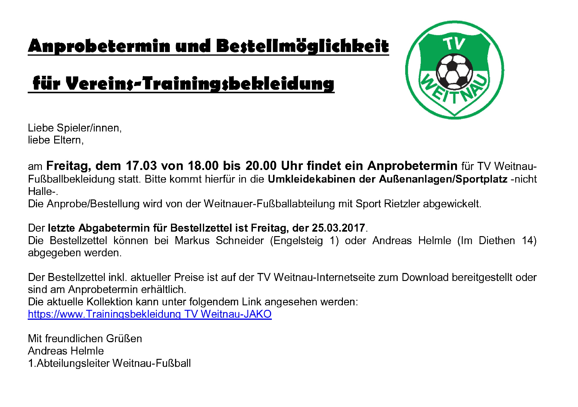 Bestellmöglichkeit und Anprobetermin von Trainingsbekleidung der Abteilung Fußball