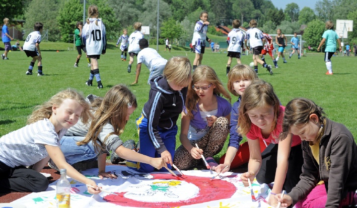 Und den Mädchen stand ein abwechslungsreiches Programm bevor. Nach der Begrüßung durch Bürgermeister Alexander Streicher und Jugendleiter Andreas Helmle, starteten gleich drei Aktivitäten parallel. Die Damen-Fußballmannschaft hatte einen Parcours nach Vorgaben der Initiative Team 2011 aufgebaut, wo sich die Mädchen an den Stationen Kurzpass-Ass, Kegelmeisterin, Elfmeterkönigin und Dribbelkünstlerin das DFB-McDonald’s-Fußballabzeichen erspielen konnten. Unter fachkundiger Anleitung der Damen-Fußballmannschaft zeigten viele der Mädchen, dass sie durchaus talentierte Fußballerinnen sind und für Kathi Ehinger und ihre Fußballdamen war dies Gelegenheit erste Kontakte mit interessierten Mädchen zu knüpfen. Gleichzeitig hatte die Schule Weitnau ein Fußballturnier der 3. und 4. Klassen – natürlich mit Beteiligung der Mädchen – organisiert. Und in den Pausen wurden von den Teilnehmenden Mädchen in künstlerischer Handarbeit Kooperationsfahnen gestaltet.