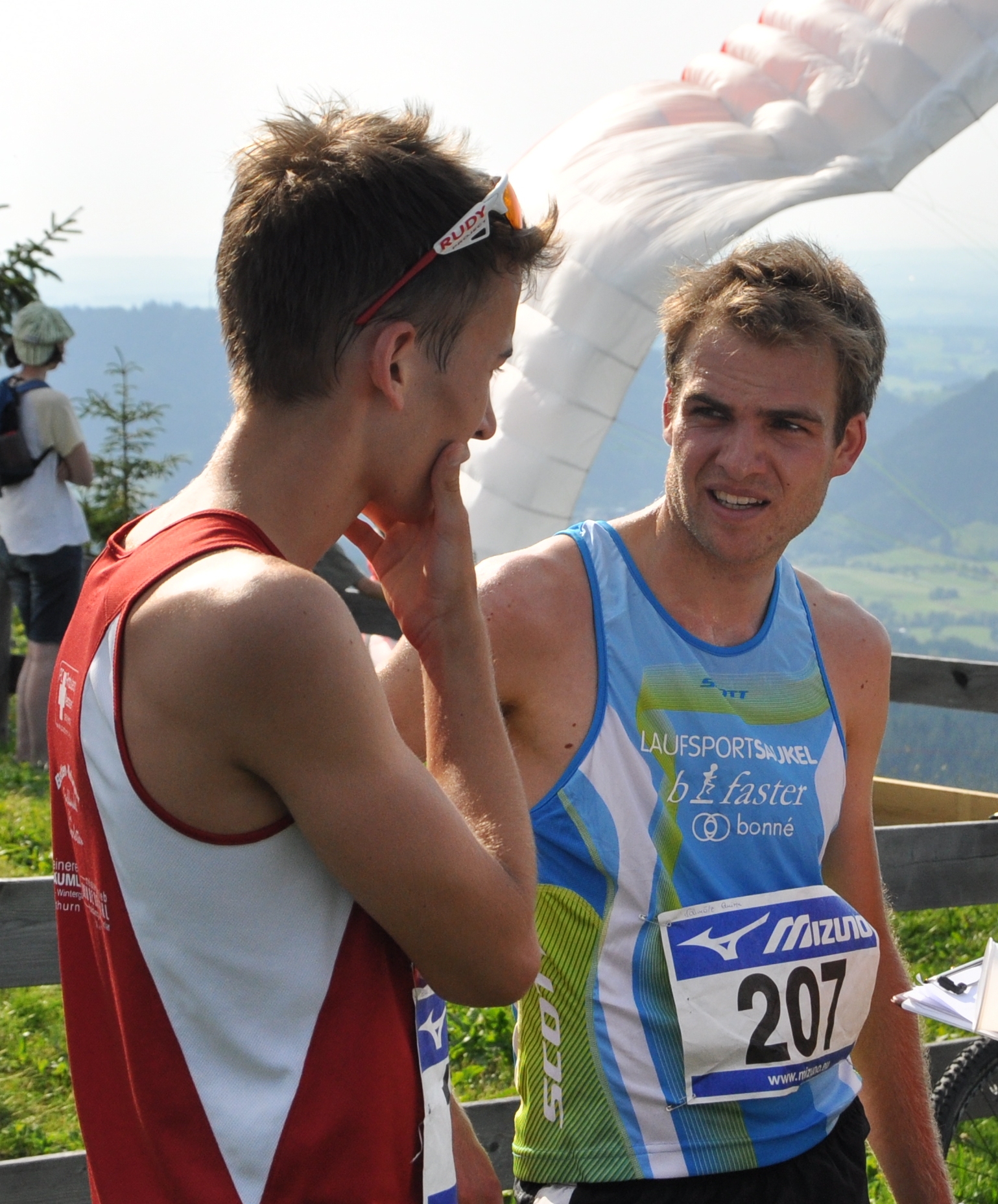 Lange Zeit sah es so aus, als ob Vorjahressieger Quirin Schmölz seinen Titel beim 31 Walter-Riedle-Hauchenberglauf verteidigen können würde, doch dann fasste sich ein ganz junges Berglauftalent ein Herz: Bei Kilometer Sechs zog Maximilian Zeus, Jahrgang 1995 von der DJK Weiden einen Zwischenspurt an und Lokalmatador Schmölz aus Missen, der für das Team Laufsport Saukel b_faster antrat, musste abreißen lassen. Im Ziel nach 6,8 Kilometer und 509 Höhenmeter standen für den Oberpfälzer 30:05 Minuten zu Buche, Schmölz überquerte die Ziellinie sechs Sekunden später. Für Zeus, der erst das zweite Mal am Hauchenberg antrat, war es gleichzeitig der Titel des Bayerischen Jugend-Berglaufmeisters. Beide Athleten waren sich einig, dass bei der sommerlichen Hitze der Streckenrekord von 28:08 Minuten nicht drin war, zumal Zeus im Endspurt gegen den acht Jahre älteren Schmölz alles geben musste. Völlig ausgepumpt im Ziel liegend gab es vom Sieger als erstes ein dickes Lob: „Tolle Strecke, tolle Organisation und eine gigantische Aussicht hier oben.“ Eine Aussage über die sich das Organisationsteam um Clemens Krinn und Dieter Herz, mit über 60 freiwilligen Helfern besonders freuen dürfte.