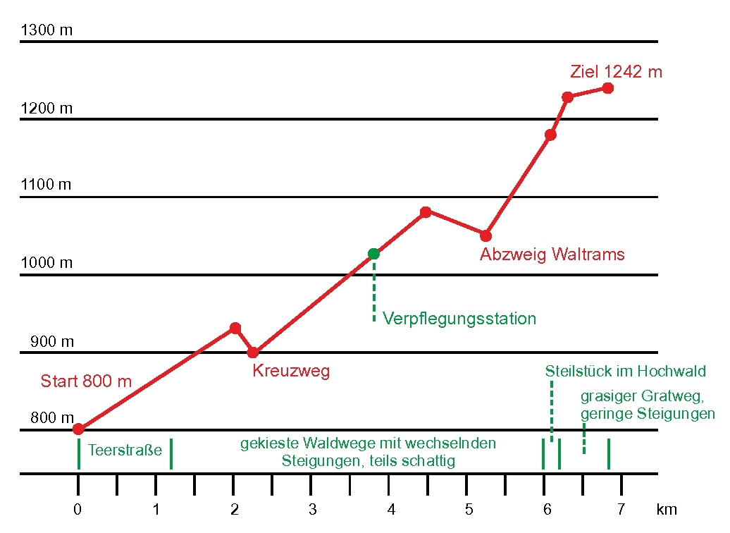 - Strecke: 1,2 km Teerstraße durch den Ort; 4,8 km gekieste Waldwege mit wechselnden Steigungen, teilweise schattig; 200m Steilstück im Hochwald; 600m grasiger Gratweg, geringe Steigungen