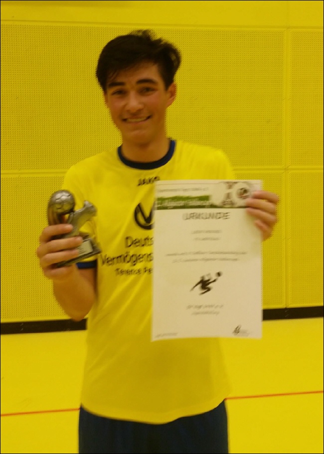 Turnierbericht beim TV Haldenwang im letzten Hallenturnier der erfolgreichen Hallensaison der U 15 gewann man das Turnier beim TV Haldenwang. Im Modus jeder gegen jeden besiegt man den Tv Bad Grönenbach ( 3:0 ), den Fc Wiggensbach ( 1:0 ), den Tv Haldenwang 2 ( 2:0 ), Türk Sport Kempten ( 2:1 ), den Sv Amendingen ( 3:0 ) und spielte gegen den Tv Haldenwang 1 Remis ( 1:1 ) Unsere Torschützen: Elias Baiz x4, Hannes Weber x4, Kevin Schneider x3, Leon Denzel x1 Kader: Alexander Wassermann, Elias Baiz, Kevin Schneider, Jonas Müller - Fassbender, Christopher Ludescher, Kevin Mccallum, Leon Denzel, Hannes Weber