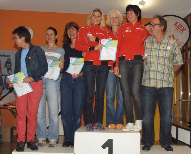 Vlnr.: Roswitha Kremser, Jutta Kadel und Elke Matthiesen, die Mannschaft aus Ruhstorf/Rott, Lauf-Organisator Dieter Herz