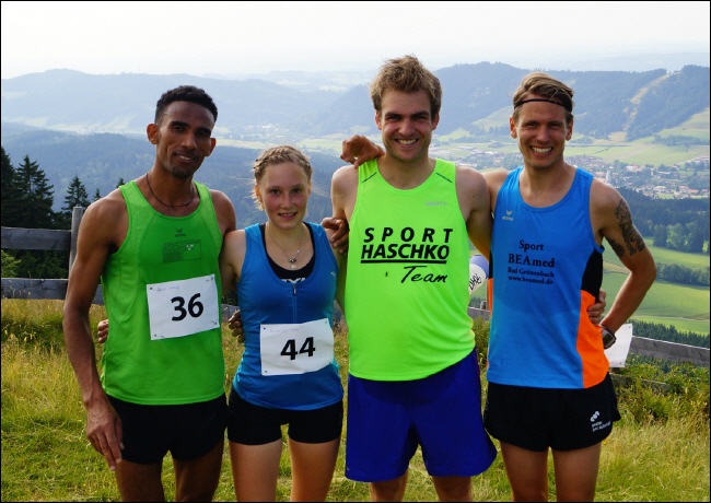 Es sei durchaus sein Ziel gewesen, den Rekord zu brechen. Die Strecke sei „beautiful und schwierig“ erklärte er in einem Mix aus Deutsch und Englisch und deutete mit den Händen die vielen Tempowechsel und die abwechselnd steilen und flachen Passagen an. Der Zweitplatzierte Edwin Singer (TV Erkheim) fasste wenig später die Qualität des Newcomers, von dem man laut Verbandslaufwart Dieter Claus demnächst noch viel hören wird, in wenigen Worten zusammen: „Das ist eine andere Laufdimension“. Auch Vorjahressieger Quirin Schmölz (Sport Haschko), der 2012 den Rekord nur knapp verfehlt hatte, gratulierte fair. Mit Singer war er sich einig, an dem jungen Mann aus Eritrea führte an dem Tag kein Weg vorbei. Der dominierte von Anfang an das hochkarätige Feld; bei Kilometer eins betrug der Abstand zu Schmölz bereits 150 Meter. Allein an der Spitze hielt Tekkle das Tempo hoch, so dass am Ende die Rekordzeit 27:50 zu Buche stand. Spannend wurde es nochmal im Duell um die Plätze. In einem packenden Schlussspurt zog Singer an Schmölz noch vorbei und holte sich wie im Vorjahr Platz zwei. Singer, dessen Vater schon am Hauchenberg gelaufen ist, kommt immer wieder gern nach Weitnau: „Toll organisierter Lauf, tolle Leute – nächstes Jahr gerne wieder!“