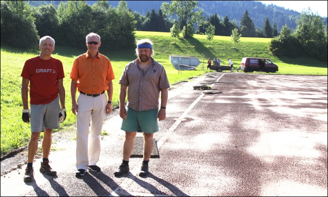 Bis der Ball dann auf Kunstrasen rollt bedarf es jedoch noch einiger hochgekrempelter Ärmel. In gemeinsamen Arbeitseinsätzen des TV Weitnau und der SG Kleinweiler-Wengen gilt es zunächst, den alten Tartanbelag zu sanieren. Dazu müssen die fehlerhaften Stellen ausgeschnitten und mit einem speziellen Gummigranulat verfüllt werden, das GebrauchtKunstrasen24 liefert. Jüngst wurden schon die festen Linien des alten Platzes entfernt und umseitig der Tartanbelag aufgeschnitten, um den Leistenstein als Anschlag für den neuen Kunstrasenbelag freizulegen. Ende August sollen die vorbereitenden Arbeiten abgeschlossen sein, dann rücken die Spezialisten aus Eschborn an und beginnen mit dem Verlegen des Kunstrasens. Was die endgültige Fertigstellung des Spielfeldes betrifft, lässt sich GebrauchtkunstRasen24-Chef Adam jedoch nicht in die Karten schauen: „Es kann ja durchaus sein, dass ich meinen Bautrupp bei einer längeren Schlechtwetterphase im Allgäu abziehen muss, dann passiert erstmal ein paar Wochen nichts mehr“, so der Unternehmer aus dem Main-Taunus-Kreis. Vertraglich ist der Zeitpunkt freilich festgelegt: „Bespielbarkeit spätestens Ende Oktober“ heißt es da.