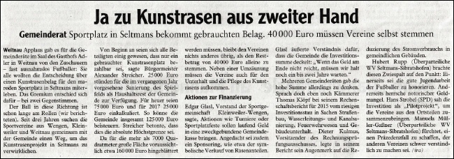 Parallel steht das Gremium seit geraumer Zeit in Kontakt mit der Spezialfirma GK24 (GebrauchtKunstrasen24.de, Inh. Thomas Adam in 65760 Eschborn), die gebrauchte Kunstrasenplätze in ganz Deutschland abbaut, weiterverkauft und neu verbaut, bzw. bei der Neuverbauung unterstützend zur Seite steht. GK24 ist deutschlandweit die einzige Firma, die Gebrauchtkunstrasen in dieser Größe liefern kann, sämtliche andere Firmen, die angesprochen wurden können nur kleinere Felder liefern. Sobald nun ein gebrauchter Kunstrasen gefunden wird, der den Größen- und Qualitätsanforderungen unseres Projektes entspricht, soll dieser gekauft und eingebaut werden. In der Vergangenheit hätte sich diese Gelegenheit schon mehrfach geboten. Bei nächster Gelegenheit wird Bürgermeister Streicher gemeinsam mit aktiven Spielern und Vertretern des Gremiums ein gebrauchtes Kunstrasenfeld, das zum Kauf steht, vor Ort in Augenschein nehmen. Wenn alles passt, kann der Platz abgebaut werden und direkt nach Seltmans geliefert werden.