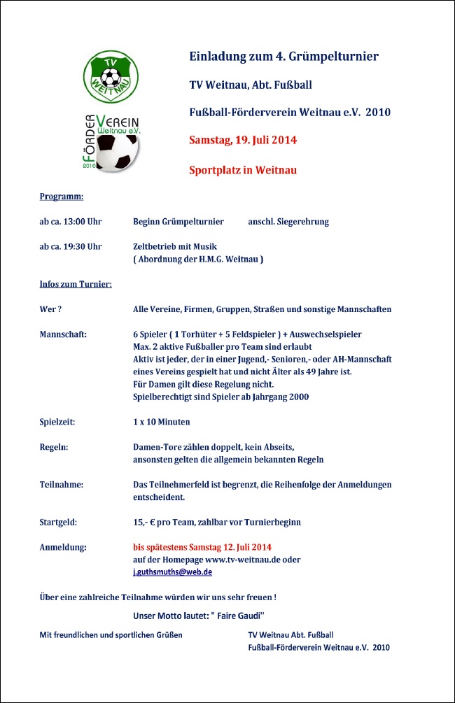 Nachmeldungen bis Samstag 28.06.14 8.30 Uhr: 15 Euro pro Team.