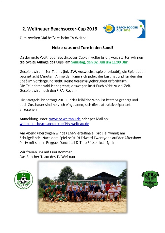 Nachmeldungen bis Samstag 25.06.16 8.30 Uhr: 15 Euro pro Team.