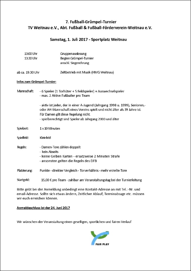 Nachmeldungen bis Samstag 24.06.17 8.30 Uhr: 15 Euro pro Team.