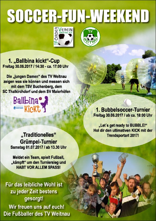vom 30.06. – 01.07.2017 findet unser alljährliches Grümpelturnier statt. In diesem Jahr gibt es jedoch zusätzlich zu dem eigentlichen Grümpelturnier zwei neue Highlights. Zum einen findet am 30.06.2017 am Nachmittag ein Mädchenfussballturnier im Rahmen des „Ballbina kickt“ Projektes statt. Der Freitagabend des 30.06.2017 läuft unter dem Motto „Weitnauer Vereinsabend“. Für diesen speziellen Abend haben wir ein BubbleSoccerGaudiTurnier organisiert, zu dem wir Euch ganz herzlich einladen möchten.