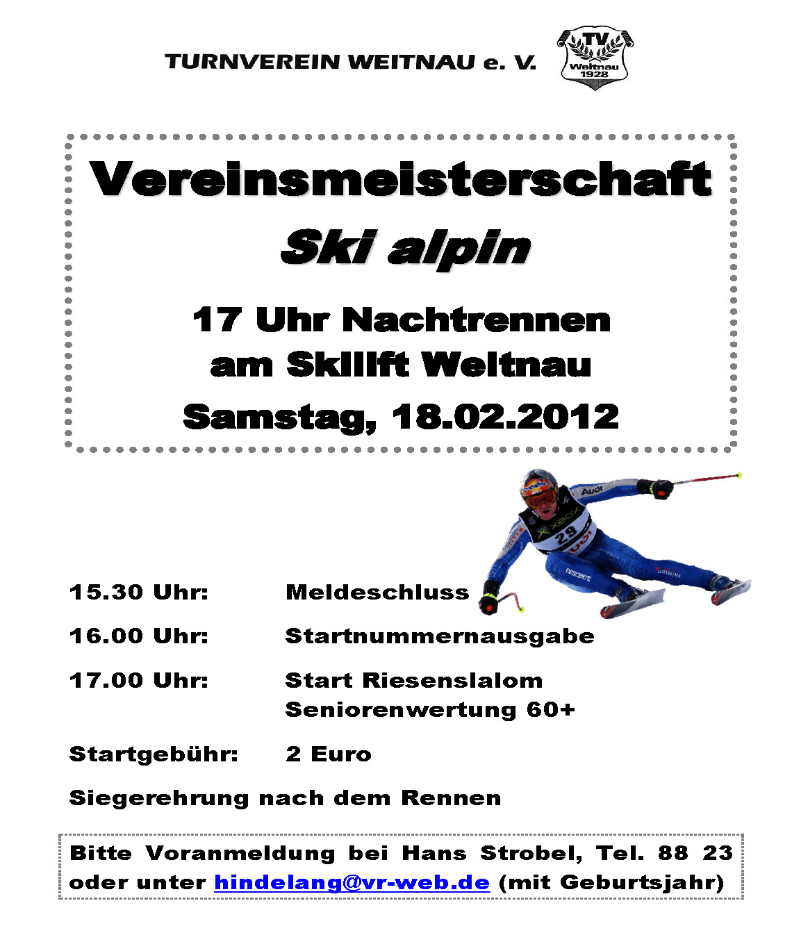 Bei ca. 200 gemeldeten Startern braucht die Skiabteilung viele Helfer, um ein gut organisiertes Rennen abzuwickeln. Deshalb bitte ich alle Helfer (gerne auch aus anderen Abteilungen) zu einer Vorbesprechung ins „Widdumstüble“ am Mittwoch 25.01.2012 um 19.00 Uhr.